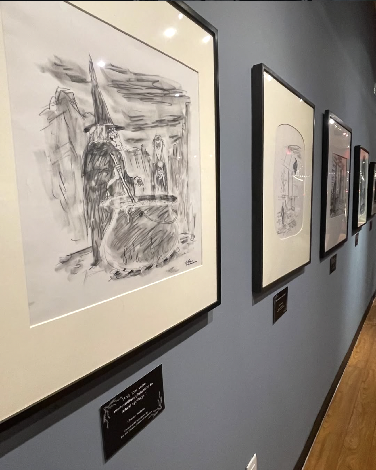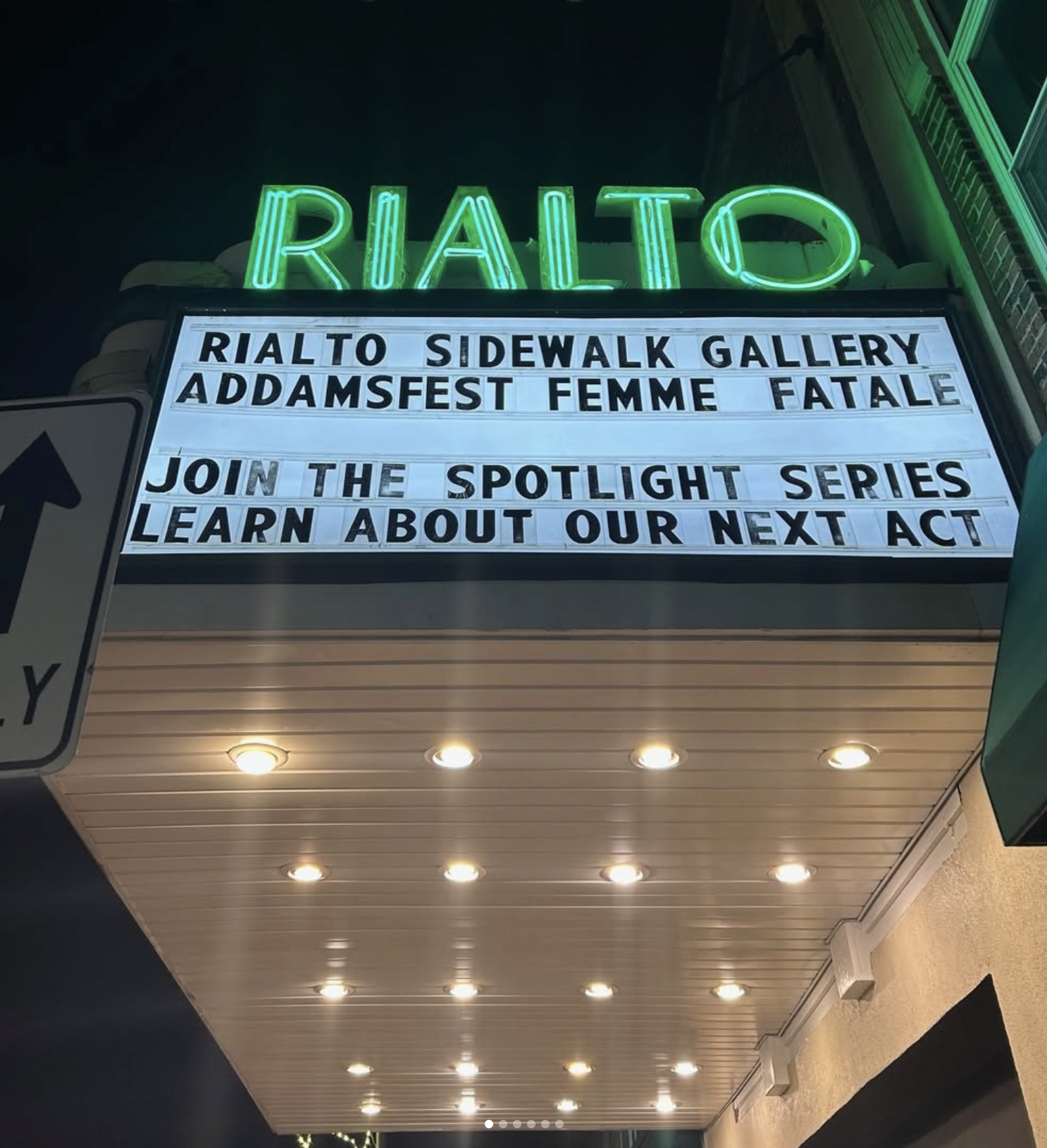 Sneak peak of the art exhibit, Charles Addams, The Addams Family cartoon, and the Rialto theatre marquee from @addamsfest on instagram