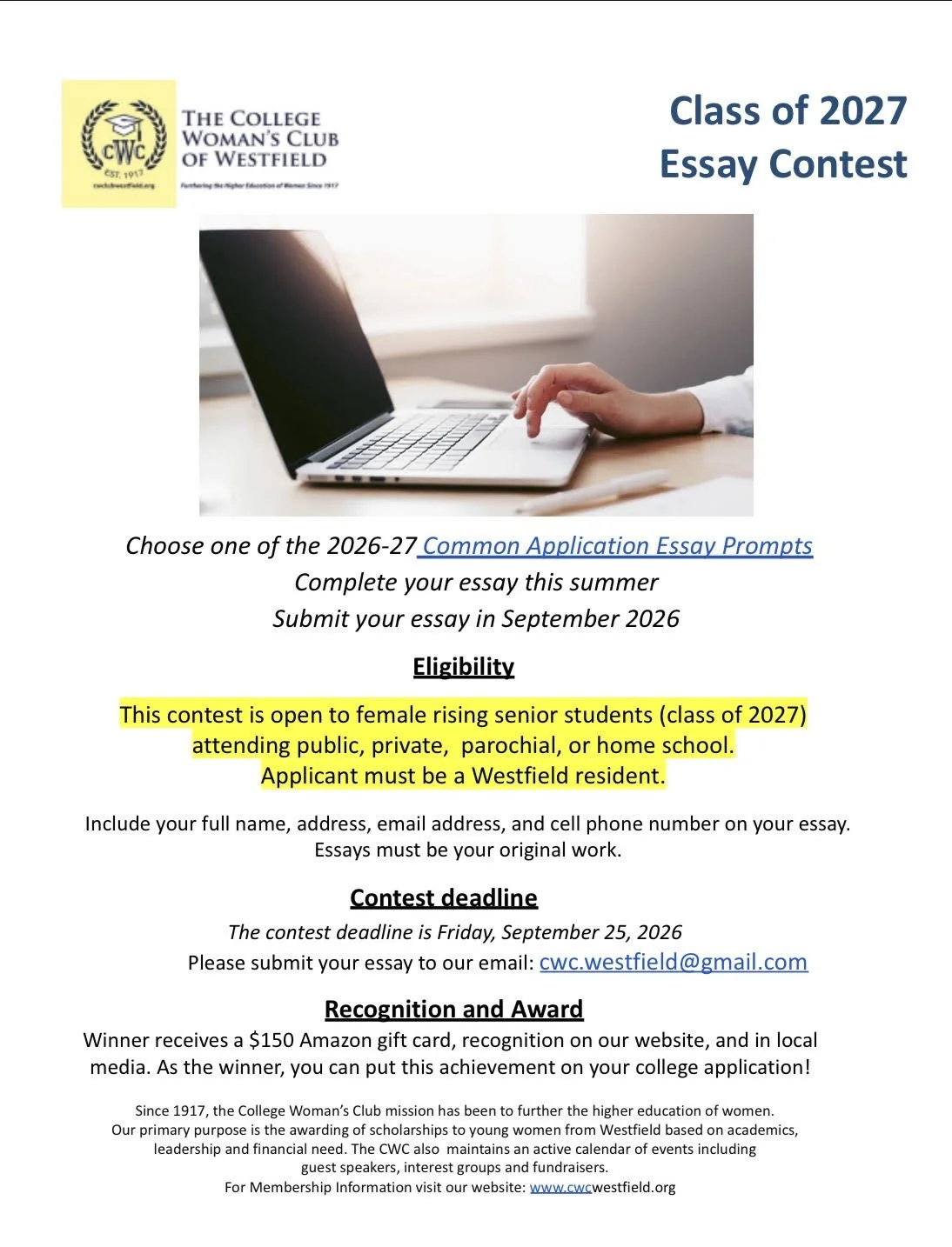 An opportunity for a Rising Senior to get started early on the College Essay a little early and earn $150 Amazon Gift Card and be able to put this achievement on your college application. We asked rising senior students to pick an essay prompt from Common Application for the year they are applying and write and submit their essay to us before September 25th.